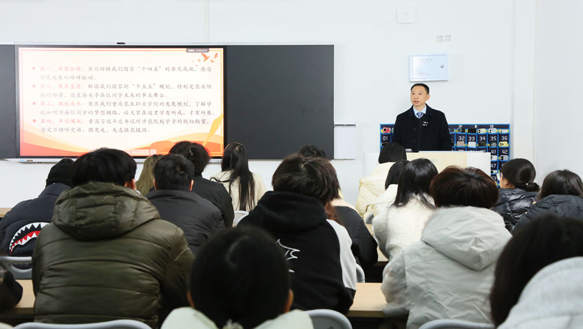 课上,学校领导陈长法以党的二十届四中全会精神为主线,系统回顾了我国“十四五”时期取得的非凡成就,重点解读了“十五五”时期国家发展蓝图,特别是关于农业领域的重要部署。他强调,涉农院校学子正处于国家农业农村现代化进程的关键“机遇期”,个人的专业学习和职业规划应与国家战略同频共振。