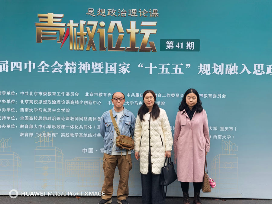2026年4月3日(星期五),我校马克思主义学院临时负责人伍能英带领思政教师张奉、杨力,赴西南大学马克思主义学院参加由中国人民大学、西南大学、北京高校思想政治理论课高精尖创新中心联合主办的思想政治理论课青椒论坛第41期活动,本期活动主题为“党的二十届四中全会精神暨国家‘十五五’规划融入思政课”。来自重庆市内各高校的百余名思政课教师共同参与了此次观摩学习。