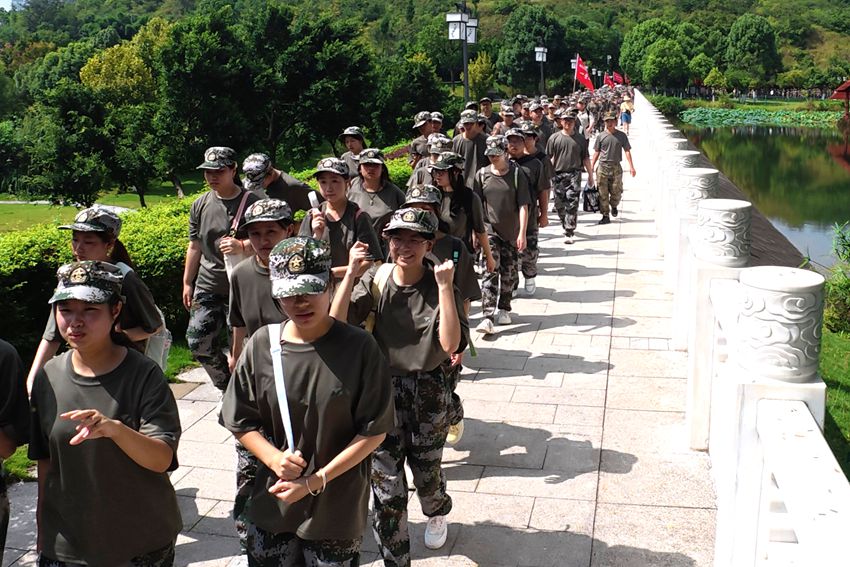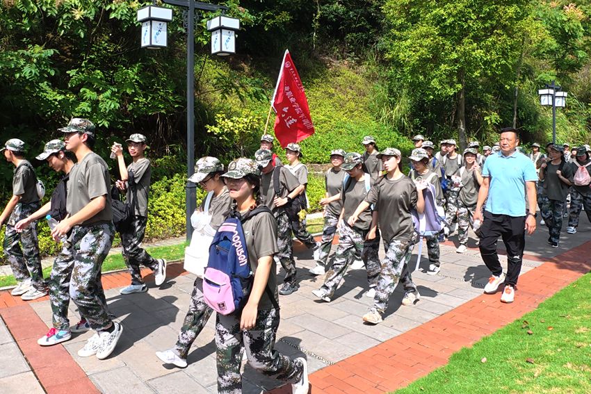 出发指令下达后,拉练队伍如一条长龙,在队旗的引领下稳步前行。军训团负责人、辅导员与教官全程陪同在队伍两侧,不时叮嘱学子调整呼吸、注意步伐。石梁湖波光粼粼,神女湖畔草木青葱,学子们精神饱满、斗志昂扬,口号声此起彼伏。行至后半程,部分新生体力渐感不支,同学们相互鼓劲,步伐慢的咬牙跟上队伍,无人轻言放弃。