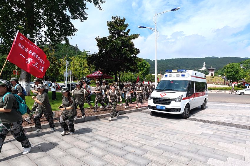2025年9月27日上午9:00,重庆农业职业学院首批高职新生迎来军训关键一课,十公里户外拉练。天气晴好,新生们身着迷彩服,以学校为起点,沿石梁湖、神女湖一线徒步跋涉,最终顺利返程。
