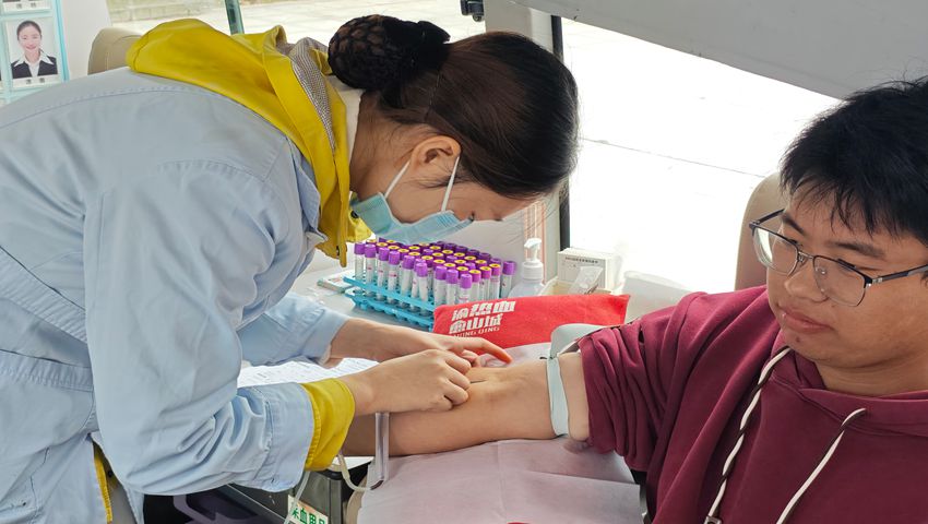 活动现场,血液中心工作人员在咨询区细致解答各类疑问。在志愿者的有序引导下,师生们依次填写无偿献血登记表,并完成血压测量、血型初筛和血液采样等流程。全程高效顺畅、温情洋溢,符合献血条件的师生主动伸出手臂,以行动为生命助力。