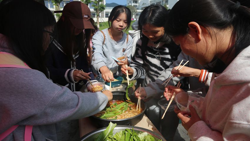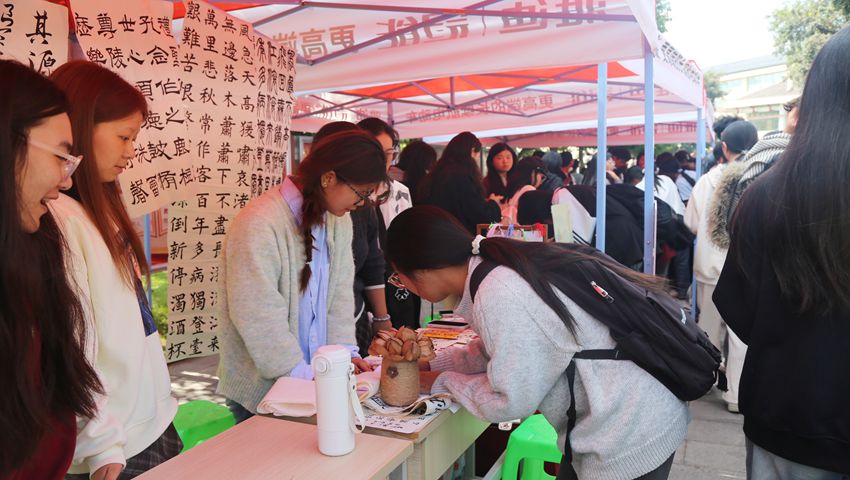活动现场人头攒动,气氛热烈,各社团展位整齐排列,社团成员们各展其能,解答新生疑问,介绍社团亮点。书法社展区挂满写有诗文的宣纸,楷书端庄大气、行书飘逸灵动,墨香伴着微风散开,宠物社的展区里,仓鼠在笼子里探头张望,蜥蜴一动不动趴在饲养箱中,好奇的同学在社员指导下轻轻触摸;另一侧展台上,舞蹈、武术、话剧、歌唱等才艺轮番上演,赢得阵阵掌声,美食社摊位前更是排起小长队,社员现场炸薯条、烤蛋挞,一旁的火锅咕嘟咕嘟冒着热气,品尝美食的同学边吃边赞,脸上满是幸福感。同学们兴致勃勃地穿梭于各展位之间,在了解各个社团情况后报名心仪的社团。
