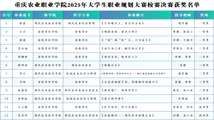 12月4日,我校第三届全国大学生职业规划大赛校赛决赛圆满落幕。经过院赛选拔,12名选手脱颖而出,站上决赛舞台,展现了农科学子的职业追求与青春担当。