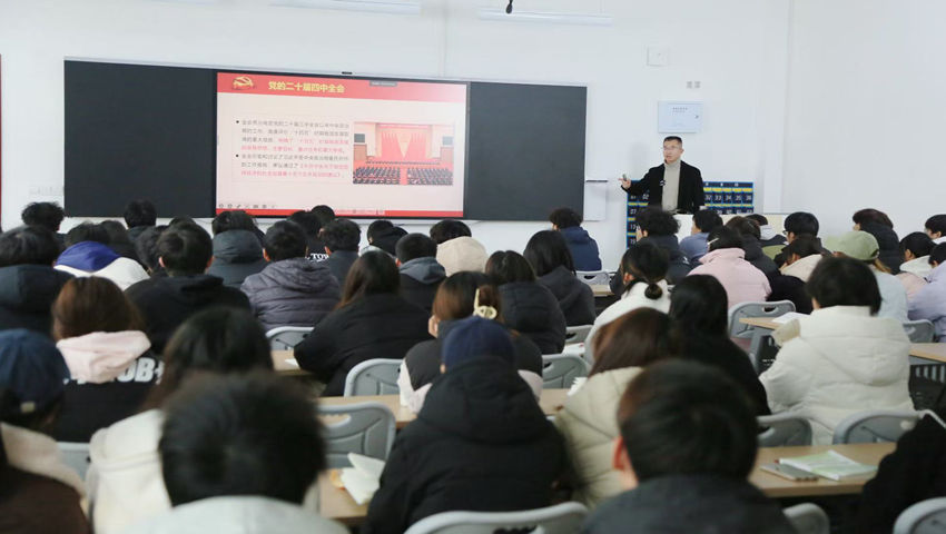 课上,刘永文系统阐述了党的二十届四中全会召开的重大意义,并结合详实的数据、发展案例以及亲身经历,生动回顾了“十四五”时期我国经济社会发展取得的历史性成就、发生的历史性变革。从高质量发展扎实推进、科技创新成果丰硕,到改革开放深化推进、民生福祉持续改善,再到绿色转型步伐加快、安全保障能力增强,为学生呈现了一幅波澜壮阔的发展画卷。